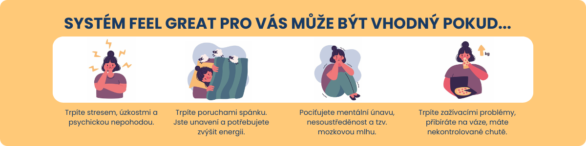 Feel Great systém je jednoduchý nástroj, jak navrátit tělu správně fungující metabolické procesy a postupně přirozeně odstranit všechny zdravotní komplikace, které s sebou inzulinová rezistence přináší. Když se uzdraví střevo a metabolické procesy v těle, zlepší se také psychické zdraví a dostaví se příliv energie.